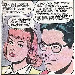 In the original Superboy stories, Lana was the girl who lived next door to the Kent family in Smallville, and was a romantic interest of Superboy.[2] In the Silver Age stories, Lana often behaved like a younger version of Lois Lane, spending much of her time trying to prove that Superboy and Clark Kent were one and the same.[3]