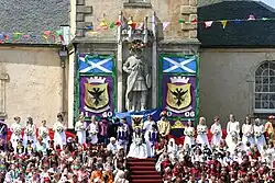 Once the procession has gone once around the town centre, the children mount a stand in front of St Nicholas Church (and a statue of William Wallace on the steeple). The court also climb the stand and the Queen is crowned by a local lady, to acclaim from the assembled crowds. "Flower of Scotland" and "Scots Wha Hae" are played, and the Lanimer Queen's Proclamation read out, followed by "God Save the King", the British national anthem.