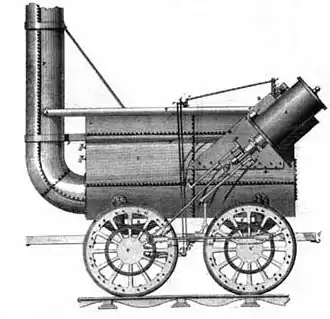 Lancashire Witch was an 0-4-0 locomotive with rear mounted cylinders inclined at 45 degrees driving to the front wheels. The rear wheels were powered via coupling rods. The boiler had two flue tubes[a] and the locomotive burnt coke, aided by bellows on the tender. It was the first locomotive with steel springs.[2] It was the first locomotive built by Robert Stephenson and Company.[3]