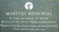The Lancaster Martyrs' Memorial Stone is dedicated "to the memory of those Martyred for their faith in Lancaster". It includes a quotation from the Gospel of Matthew (20:22): "Can you drink the Chalice that I am about to drink? They said to Him, we can."[6]