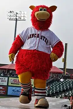 The Lancaster Stormers' mascot is an anthropomorphic, red cow named Cylo. He wears the team's home jersey with striped socks and retro-style sneakers. Cylo debuted on March 4, 2005, at the Mascot Roller Mill in the Lancaster County village of Mascot. His name in full is Cyloicious L. Barnstormer, alluding to Hall of Fame pitcher Cy Young and to silos, representing the county's agricultural heritage.[34] The mascot was designed by the Raymond Entertainment Group,[34] which also produces the Phillie Phanatic's costume.
