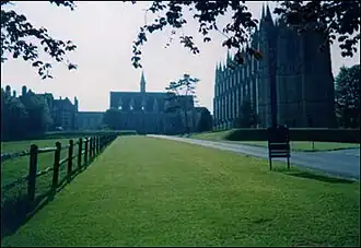 The college chapel is a Grade I listed building that was finally completed in 2022.[8] The first phase of its construction began in 1863 with the installation of the foundations of the building, completed five years later. One report states that the foundations are 60 feet (18 m) deep.[9] The structure itself would not be fully completed until long after Woodard's death in 1891, although the tower at the west end that had been planned in the 1800s would not be built as of 2024;[10] the tower had been intended to raise the height to 100 metres (330 ft). The apex of the vaulting rises to 27.4 metres (90 ft).[11] It was designed[12] by R. H. Carpenter and William Slater, and is built of Sussex sandstone from Scaynes Hill.