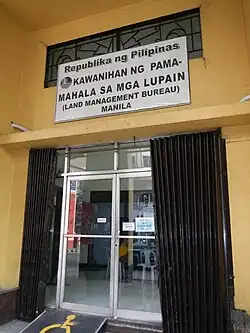 The Land Management Bureau (LMB; Filipino: Kawanihan ng Pamamahala sa mga Lupa is an agency of the Philippine government under the Department of Environment and Natural Resources responsible for administering, surveying, managing, and disposing Alienable and Disposable (A&D) lands and other government lands not placed under the jurisdiction of other government agencies.