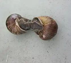 The great majority of land snails are hermaphrodites with a full set of reproductive organs of both sexes, able to produce both spermatozoa and ova. A few groups of land snails such as the Pomatiidae, which are distantly related to periwinkles, have separate sexes: male and female. The age of sexual maturity varies depending on species of snail, ranging from as little as 6 weeks[19] to 5 years.[20] Adverse environmental conditions may delay sexual maturity in some snail species.[21]