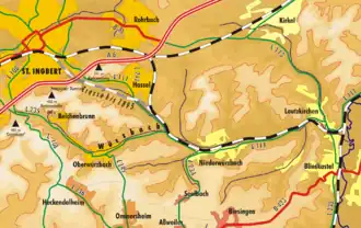 As a result of German defeat in World War II, there was an initial decline of the Landau–Rohrbach railway when the second track of the line was removed between 1945 and 1948 as part of German reparations during the French occupation.[11] Also affecting the development of the Southern Palatinate line was the electrification of the Palatine Ludwig Railway, which took place in the years 1960–1964. Especially in the Kaiserslautern–Neustadt section, the difficult topography (including many tunnels) meant that this work required single-track operations and speed restrictions so that the capacity of the line was limited. For this reason, during the same period freight traffic was diverted over the Queichtalbahn, so that there was an initial increase of traffic on the line. However, this changed with the completion of electrification work in 1964. The freight on the Queichtalbahn declined rapidly as it now largely ran over the much higher-capacity Palatine Ludwig Railway. For passengers, the line regained some of its importance for the operation of long-distance trains, especially from Saarbrücken to southern Germany, because the line is somewhat shorter that the Palatine Ludwig Railway. In this context, Landau also received a new station building, as the old building was very badly damaged during the war. The centenary of the line in 1975 was celebrated with steam train services, among other things.