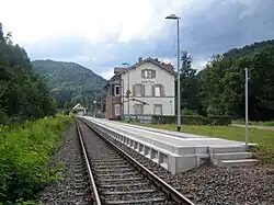 First, the Landau–Annweiler section was built, partly over sections of the Albersweiler Canal, which had been built in the late 17th century, and operations started on 12 September 1874. As early as 25 November 1875, the line was extended to Zweibrücken and connected to the link to the Palatine Ludwig Railway.[6][7] Conceptually, it was a direct continuation of the Germersheim–Landau railway and the official chainage (distance markings) run in sequence over both routes. At the same time, a branch line was opened from Biebermühle station, which is located at the confluence of the Rodalb with the Schwarzenbach, to Pirmasens. In addition, the original Zweibrücken station was not in an appropriate location for a through station and it had to be so moved to its present location. Although the line was initially built as a single track, its track base, engineering structures and crossings were designed to be duplicated.
