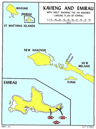 Emirau (or Emira) is an island in the Bismarck Archipelago in the south eastern portion of the St. Matthias Islands, located 25 miles (40 km) from Mussau Island, the other principal island in the St. Matthias group, and 90 miles (140 km) from Kavieng. Emirau is about 8 miles (13 km) long and 2 miles (3.2 km) wide, hilly, and heavily wooded. Inland is a 90-acre (36 ha) plateau. The climate is tropical, with high humidity and heavy rainfall. There is a small harbor, Hamburg Bay, on the north west coast. About 300 natives lived on the island;[7] but all available intelligence indicated that the Japanese had not occupied the islands in any appreciable strength. Emirau was considered suitable for development as an airbase and base for PT boats. A photo reconnaissance mission on 16 March revealed no indication whatsoever of enemy activity or installations.[8]