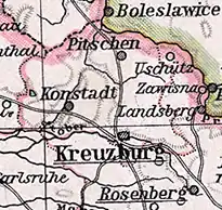 In the course of the Stein-Hardenberg Reforms, the district of Kreuzburg in the Province of Silesia was initially assigned to Regierungsbezirk Breslau, but then on May 1, 1820, it was reclassified to Regierungsbezirk Oppeln. Since then, the district has been considered part of Upper Silesia.[1] The district capital was changed to Konstadt (Wołczyn), but was moved back to Kreuzburg on January 1, 1880. The spelling of the name of the city and the district fluctuated between Creutzburg, Creuzburg and Kreuzburg. The city and district name was officially set to Kreuzburg in Oberschlesien on September 23, 1881. Later, the abbreviation Kreuzburg OS was adopted.