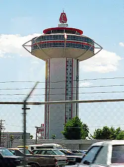 By December 1961,[25] Caroll had opened the two-story Landmark Plaza shopping center,[26][27] built out in an L-shape[3][20] at the base of the tower.[4][26] The Landmark Apartments, with 120 units,[28] were also built near the tower and operational by the end of 1961.[29][30] In 1962, a bar known as Shannon's Saloon and a western music radio station, KVEG, began operating in the Landmark Plaza.[31][32][33] In addition to studios, KVEG also had its offices in the shopping center.[32][33]