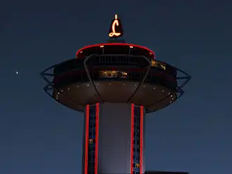 Construction had reached the 26th floor by the end of April 1962. Upon completion of the floor, work was to begin on the tower's bubble dome.[5] By June 1962, ABCC loaned an additional $300,000 to Caroll, who reached his $3 million loan limit with the company.[37][38] Caroll ultimately owed ABCC a total of $3.5 million.[39] In August 1962, the Landmark tower was designated as a civilian fallout shelter, with the capacity to hold 3,500 people after its completion.[40] That month, work was underway on the steel framework base for the tower's glass bubble dome.[41]