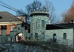 Castle Point is the highest point in Hoboken. The name is a corruption of "Castille Point", due to its supposed resemblance to the Castilian coast. To early navigators, the high serpentine crag jutting over the river reminded them of a miniature Rock of Gibraltar. The land was bought at public auction in 1804 by Col. John Stevens, who built his estate there.[2] After his death, his son Edwin Augustus Stevens took responsibility of the estate and in 1853 built a 40-room mansion, the "Stevens Castle", on land adjacent to the point. It was acquired by Stevens Institute of Technology in 1910 and served as an administrative and residential building until 1959. Castle Point is still part of the Stevens campus. It overlooks Sybil's Cave.[3]