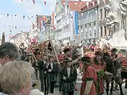 The number of members of "Die Förderer" society rose from 855 to 7146 during the years 1973 to 2013.[1] The renewed interest in medieval history made the event a major success in terms of tourism. Today the 60,000 or so inhabitants of Landshut welcome 600,000 to 700,000 visitors during the three weeks of the festivities, with some 120,000 visitors watching the bridal procession. The sponsors are able to collect money in the range of 3.5 million euros to allow for the event to take place.