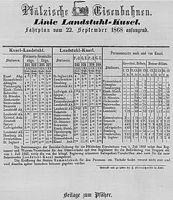In the early 1860s, the towns of Ramstein and Kusel, which at the time were part of the Kingdom of Bavaria, formed committees to promote the construction of a railway. According to a memorandum published in Kusel in 1861, the railway would branch from the Palatine Ludwig Railway in Landstuhl and run through the Mohrbach, Glan and Kuselbach valleys to Kusel. In the memorandum, it was argued that, among other things, the railway construction would improve the rather poor economic and social conditions of the region.[2] The construction of the proposed Landstuhl–Kusel line under a concession issued in 1866 was funded by an issue of shares for a total of 1,740,000 guilders. The company also was given a government guarantee on its interest.[3]
