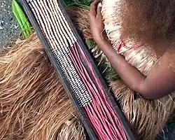 Four different types of shell are used in making shell money, A red lipped rock oyster known as "romu" (Chama pacifica in the family Chamidae), white shell known as "ke'e" (Beguina semiorbiculata in the Carditidae), black horse mussel shells called "kurila" (Atrina vexillum in the Pinnidae) and thick white disks from a rigid cockle known as "kakadu" or "kakandu" (Anadara granosa in the Arcidae)[15][16]