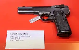 The Langenhan pistol, officially known as the F.L. Selbstlader Cal. 7,65, is a German pistol, designed by Friedrich Langehan and used by German military men, and the police during World War I. The design of the pistol is also similar to the design of FN M1900 pistol. About 55,000 pistols were produced.