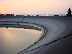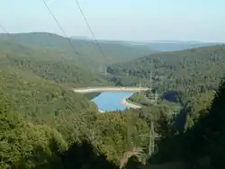 The lower reservoir, situated at 50°03′19″N 9°35′16″E / 50.05528°N 9.58778°E, is fed by a creek, which is mostly dry in the summer. Therefore, if necessary, water is pumped from a further retention basin, which is situated 1.2 kilometres (0.75 mi) below the lower reservoir. Both dams (of upper and lower reservoir) are rock fill embankment dams with an asphaltic concrete external sealing.