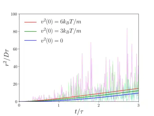 Consider a free particle of mass with equation of motion described by where is the particle velocity, is the particle mobility, and is a rapidly fluctuating force whose time-average vanishes over a characteristic timescale of particle collisions, i.e. . The general solution to the equation of motion is where is the correlation time of the noise term. It can also be shown that the autocorrelation function of the particle velocity is given by[10] where we have used the property that the variables and become uncorrelated for time separations . Besides, the value of is set to be equal to such that it obeys the equipartition theorem. If the system is initially at thermal equilibrium already with , then for all , meaning that the system remains at equilibrium at all times.