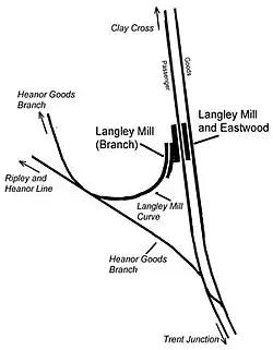 The line came into being as competition for the GNR's branch. It was completed as far as Heanor by 1890. It took another five years to reach Langley Mill where it joined a line called the Heanor Goods Branch which actually connected to a Butterley Company line to a group of collieries around Heanor.[3] It then passed along a short tightly curved spur to reach the platform with its own waiting room and toilet. A runaround loop was provided but no means for turning.[4]