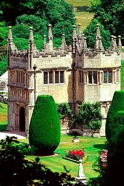 Lanhydrock estate belonged to the Augustinian priory of St Petroc at Bodmin but the Dissolution of the Monasteries during the 1530s saw it pass into private hands. In 1620 wealthy merchant Sir Richard Robartes, of Truro, acquired the estate and began building Lanhydrock House, designed to a four-sided layout around a central courtyard and constructed of grey granite. Robartes died in 1624 but work on the building was continued by his son John Robartes, 1st Earl of Radnor, a notable public figure who served as Lord Privy Seal and Lord President of the Council. The embattled walls were built of rude (rough), massive granite blocks with years 1636 and 1642 on the walls, indicating when they were built. A barbican gate was added and the house was garrisoned by Parliamentary forces in August 1644 when Sir Richard Grenville, 1st Baronet took possession.[1]