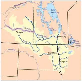 ![]() The Red River drainage basin, with the Qu'Appelle River highlighted | |