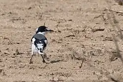 The white-tailed shrike (Lanioturdus torquatus) is a small passerine bird from the family Platysteiridae. It is also known as the chatshrike or ground batis. It occurs only in western Angola and Namibia in thorn scrub. It forages from ground level, where it hops about in large bounds and upright posture, to 25m above ground, scanning for insects. The very short tail, with a small black mark at the tip of the central two feathers, is always carried down, never sticking up. Its range of calls includes loud ringing territorial whistles.