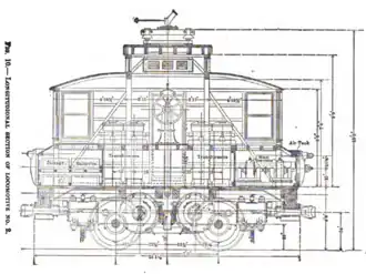 On February 3, 1902, the company completed a 18.5-mile (29.8 km) line as far as St. Johns. On entering Lansing trains joined the Cedar Street line of the local streetcar system. The electrical systems were not yet ready, so the railroad was operated by steam locomotives supplied by the Michigan Suburban Railroad. Arnold's account states that steam service began on November 15, 1901; Meints puts the completion of the line in February 1902.[2][3] Construction of the overhead lines was finished by December 1902, and tests began the following March. The first trial trips occurred on June 15, 1903, using a specially-built experimental locomotive. The company had ordered three interurban cars from the Jewett Car Company of Jewett, Ohio. These were of wooden construction, 56 feet 5 inches (17.20 m) in length, capable of seating 50 passengers, but at that stage Arnold's experimental motor lacked the motive power to drive them. A new locomotive fitted with two motors was readied for tests in early December, but a fire swept through the company's car house, destroying the locomotive, two of the Jewett cars, and a steam locomotive. While engineers constructed a new locomotive, "Phoenix," the company rebuilt the line to permit DC operation, thereby allowing Lansing streetcars to operate over it. On August 3, 1904, the new locomotive made a trial run of 8 miles (13 km) out to DeWitt. A blown circuit breaker ended the test prematurely.[4][5]