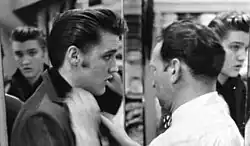 At the start of 1952, Bernard noticed a young man who would continuously walk past his window and look inside, but never actually came inside to buy anything. Eventually, Bernard went to invite the man in. It was seventeen-year-old Elvis Presley, who worked at the local Loew's Theatre. According to Bernard Lansky, Elvis told him he was going to buy him out when he got enough money. According to the historical marker on Beale Street in Memphis, Bernard Lansky responded: "Elvis, don't buy me, buy from me!" Once Elvis became an international superstar, Lansky Brothers provided much of his attire, including his outfit for his first appearance on The Ed Sullivan Show in 1956. "I put Elvis in his first suit, and I put him in his last," Lansky recalls.[1][2]