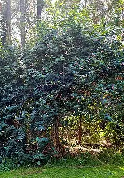 L. camara is listed in the IUCN's "List of the world's 100 worst invasive species".[39] L. camara is considered to be a weed in large areas of the Paleotropics where it has established itself. In agricultural areas or secondary forests it can become the dominant understorey shrub, crowding out other native species and reducing biodiversity.[21] The formation of dense thickets of L. camara can significantly slow down the regeneration of forests by preventing the growth of new trees.[4]