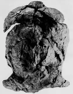 The Gongwangling skull is relatively complete, and comprises the frontal bone (forehead), most of the parietal bones (top of the head), the right temporal bone (sides of the head), the bottom margins of the nasal bones (between the eyes), and pieces of the maxillae (upper jaws). It is a bit distorted, with the right orbit jutting out farther than the left, several elements are slightly flattened, the depressions and the middle of the frontal bone are craggy due to corrosion, and the left parietal flexes out a bit more than normal. Based on the size and wearing of the molars (and assuming they degrade faster than those of modern humans), Woo estimated the individual was a 30 year old female. Overall, the skull is quite archaic, according to Woo reminiscent of the contemporary Mojokerto skull from Java.[4] Woo calculated a brain volume of about 780 cc, which is quite small for H. erectus.[4] For comparison, later Asian H. erectus average roughly 1,000 cc,[13] and present-day modern humans 1,270 cc for males and 1,130 cc for females.[14] Contemporary African archaic humans (H. habilis, H. rudolfensis, and H. e? ergaster) ranged from 500–900 cc.[15]