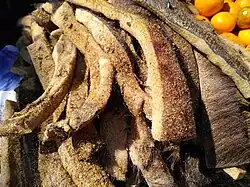 - Dried water buffalo skin – (Lao: ໜັງເຄັມ; Lao pronunciation: [nǎŋ.kʰém]) used in jaew bong and stews.