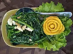 - Water spinach – (Lao: ຜັກບົ້ງ, Isan: ผักบุ้ง, Lao pronunciation: [pʰák.bûŋ]), stir-fried, steamed, or eaten raw as an accompaniment.