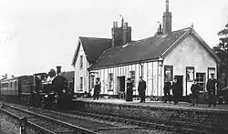 The railway between Crediton and Barnstaple was opened by the North Devon Railway on 1 August 1854 but there was no station at Lapford until 20 September 1855[2] when a platform was opened on the north side of the single track to the west of the road bridge. This was provided with a stone building containing the offices and a house for the station master,[3]