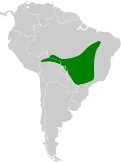 The large-billed antwren is found south of most of Amazonia. It occurs in the northern parts of Bolivia's Beni and Santa Cruz departments and in south-central to northeastern Brazil. Its Brazilian range is roughly bounded by the states of Mato Grosso, Tocantins, and Paraná though it is found locally as far northeast as southern Ceará and Piauí. It inhabits deciduous and semi-deciduous forest, gallery forest, and palm groves, and does not favor any particular level of the forest. In Bolivia it also often inhabits small patches of forest in otherwise open cerrado. In elevation it ranges from about 150 to 1,100 m (500 to 3,600 ft).[5][6]