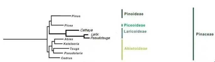 For other authors, finally, the subfamily Laricoideae would have no taxonomic dignity of its own, recognizing only two large multi-group clades (Pinoid and Abietoid[10]) or subfamilies (Pinoideae and Abietoideae[11]) in their cladistics systems. Larix, Pseudotsuga and Cathaya would be included in the pines complex.[11]