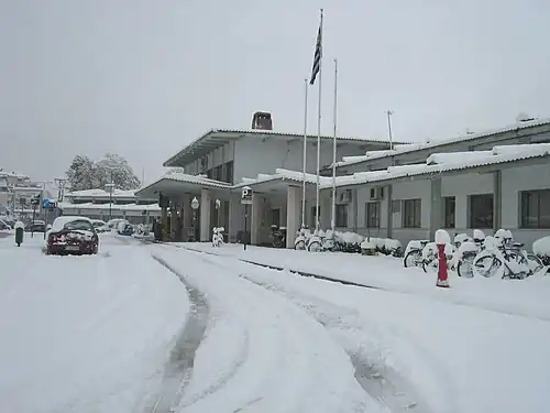 In 2009, with the Greek debt crisis unfolding OSE's Management was forced to reduce services across the network. Timetables were cut back, and routes closed as the government-run entity attempted to reduce overheads. In 2011 it was reported that the Greek government was looking at divestiture of certain high-profile assets of OSE, namely a number of the larger terminal stations, most notably Athens, Piraeus, Thessaloniki, Volos and also Larissa.[23] In January 2017, heavy snowfall forced many trains services to be suspended.[24] In 2017 OSE's passenger transport sector was privatised as TrainOSE, (Now Hellenic Train) a wholly owned subsidiary of Ferrovie dello Stato Italiane.[25] Infrastructure, including stations, remained under the control of OSE. In 2018 a new coffee shop opened within the station.[26] In 2019 the station received negative publicity after it was reported the high levels of rubbish left in and around the station.[27][28][29] The issue stemmed for one of finally responsibility[30] for cleaning and maintaining the station forecourt.[31][32] In October 2019, the station played host to a Training Seminar The train goes… school… and protects the environment, health and culture.[33] The event was organised via the Directorates of Primary Education of Larissa and Magnesia (through the Responsible School Activities and in collaboration with the Regional Center for Educational Planning (PEKES) of PDE Thessaly, Coordination of Sustainability of Thessaly and OSE).[33] The event was held on 16 October 2019 from 17.00 to 20.00 within the station building.