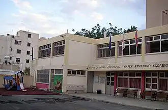 The Nareg Armenian School (Greek: Αρμενικό Σχολείο Ναρέκ; Armenian: Նարեկ հայկական վարժարան), also known as the Larnaca Armenian School, is located in Larnaca. As of 1972, it has been called Nareg, after Saint Krikor Naregatsi. It's located on 21, Armenian church street in central Larnaca, next to the Sourp Stepanos church. The current building was built between 1993-1995 by the Technical Services of the Ministry of Education and was inaugurated on 18 May 1996 by the then-President of Cyprus Glafcos Clerides.[1] Currently, the school has about 25 students. As all other Nareg Schools (Nicosia, Larnaca, Limassol), it is under a single principal, as of 2009 Vera Tahmazian, and under the tutelage of the Nareg Armenian Schools Committee.