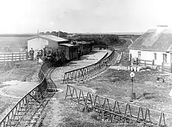 This was a 14.4 km (8.9 mi) monorail built on the Lartigue principle in County Kerry in Ireland. It linked Ballybunion with the North Kerry line at Listowel. It had one intermediate station and a passing loop at Lisselton. The line ran beside the main Listowel/Ballybunion road (R553). It officially opened on 29 February 1888,[2] public services beginning on 5 March.[3] The track was prefabricated and easily erected, and the capital cost was £33,000, far lower than a conventional railway. No baronial guarantees were sought. However, the system had significant operating drawbacks.