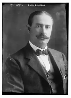 Anderson returned to the diplomatic corps in 1911 as United States Minister to Belgium, serving from November 18, 1911 until November 15, 1912, when he was appointed Ambassador to Japan. He held this post as a fully accredited and confirmed American ambassador for only one day, March 3, 1913, though he was in Japan from December 28, 1912, until his return to the United States on March 16, 1913. He resigned when the Republican administration of William Howard Taft was replaced by the Democratic administration of Woodrow Wilson.[6][7] The exact reasons for his resignation and departure from Japan are not clear. One American newspaper reported that he left his Tokyo post "because the Japanese government had declined to receive him."[8]