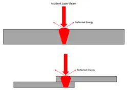 Transmission of laser energy through certain polymers allows for processes such as through transmission welding. When the laser beam travel through the interfaces between different medium, the laser beam is refracted unless the path is perpendicular to the surface. This effect needs to be considered when laser travels through multi-layer to reach the joint region.[4]