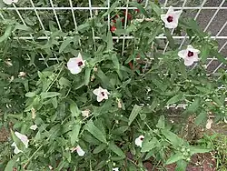 The hibiscus-like flowers are pink with a red throat. Flowers solitary in the leaf axils, on petioles shorter than the leaves. Outer lining almost as long as the lining, hairy. Petals up to 1.2 cm long, white to reddish purple with dark basal spot. Stamens gave 12 pieces. The first flowers in spring are often cleistogamous and much smaller than those that come later in the season. Flowering occurs profusely during summer and autumn.[5]