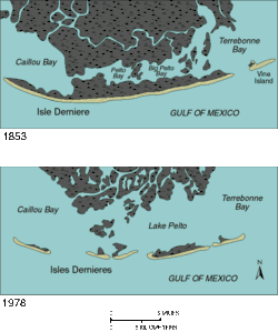 The island was originally approximately 25 miles[2] in length before being split in half by the storm. Subsequent tropical storms did more damage, and Isle Dernière was further fragmented into smaller islands.[1] Now the Isles Dernieres Barrier Island Refuge, since the 1990s there have been a number of different projects aimed at rebuilding and protecting the islands,[3] including in 1998, when sand was suctioned up to raise the level of the islands, and plantings were made to keep the new land in place.[1]