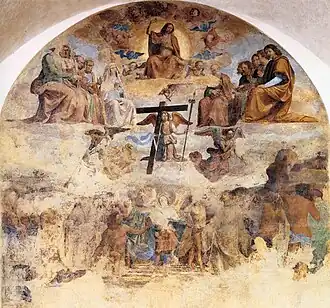 On 22 April 1499, Gerozzo di Monna Vanna Dini commissioned the work from Fra Bartolomeo, though he was only able to complete the upper part of the lunette before taking vows as a Dominican friar on 26 July 1500 and temporarily renouncing painting.[2] Using Fra Bartolomeo's "finished cartoon" and preparatory drawings, Albertinelli completed the fresco and received payment on 11 March 1501.[3]
