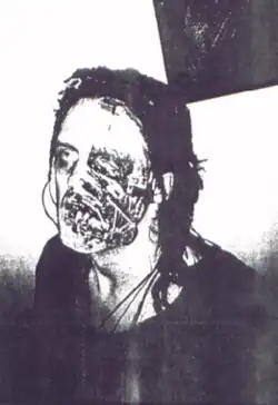 In preparation for the upcoming Last Rights shows, Ogre and William Morrison recorded and edited sixty-six minutes of backing video to sync up with the live performances.[26] This footage was recorded at the same time as the "Killing Game" music video, which was intended to be a sample of the live show.[42] Meanwhile, Gore was designing and fabricating the tour's many props and Ogre's many costumes. The two main elements, a virtual reality machine and a spinning display of severed heads called the Tree of No Cares, were set up on either side of the stage.[42] The VR apparatus, into which Ogre occasionally went throughout the performance, represented his addiction[42] and eventually came to mutate him.[43] The backing film was timed so that whenever Ogre entered the machine, his face would appear onscreen and the audience could watch as something attacked and tortured him.[42] Each time Ogre emerged from the apparatus, he would be altered. Gore also designed an elaborate full-body suit known as the Guiltman.[3] Only appearing for the performance of "Left Handshake" at the end of each show, the Guiltman combined imagery of drug abuse and deformed sexuality to represent Ogre at the lowest point of addiction.[42]