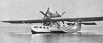 The Latécoère 23 was a development of the Latécoère 21, the latter Latécoère's first flying boat to leave the water.[1] It kept the same general arrangement, a parasol winged machine with a centrally mounted push-pull pair of engines and sponsons for stability on the water. Its wing, like that of the earlier aircraft was very rectangular and of mixed wood and metal construction.[1] The span was increased by 27% and the wing area by about the same. The sharply cropped wingtips of the Latécoère 21 were replaced by bevelled ends of decreasing thickness. The Latécoère 23 carried full span ailerons in three sections per wing, fitted with trim tabs.[1] The wings were not attached directly to the fuselage, but to the sponsons: on each side a parallel pair of streamlined struts leaned outwards from near the tip of the sponson to mid-wing, and a second pair ran inwards to the wing centreline below the engines. On the Latécoère 21 the engines were mounted on the chord line, but the two 500 hp (373 kW) Farman 12 Wes of the later aircraft were mounted on the upper surface of the wing. Propellers were four bladed and wooden.[1]