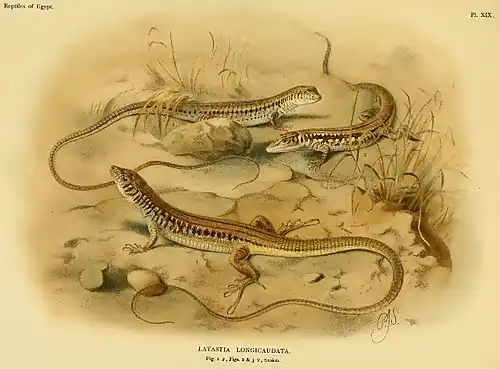 - Latastia longicaudata (Reuss, 1834) – southern long-tailed lizard, common long-tailed lizard