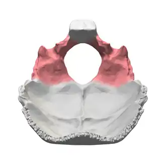 ![]() Human skull seen from above (parietal bones removed.) Lateral parts of occipital bone shown in red. | |