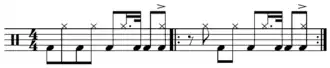 Although the exact origins of jazz syncopation may never be known, there is evidence that the habanera-tresillo was there at its conception. Buddy Bolden, the first known jazz musician, is credited with creating the big four, a habanera-based pattern. The big four (below) was the first syncopated bass drum pattern to deviate from the standard on-the-beat march.[9] As the example below shows, the second half of the big four pattern is the habanera rhythm.