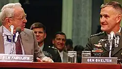 In his first two weeks in the Senate, Faircloth was appointed to serve on the United States Senate Committee on Environment and Public Works, the United States Senate Committee on Banking, Housing, and Urban Affairs, and the United States Senate Committee on Armed Services.[33] While on the Armed Service Committee, he opposed the inclusion of homosexuals in the military and claimed the number of AIDS-infected people in the military would only increase if it were to happen.[34] He opposed the Clinton administration's "don't ask, don't tell" policy and said it was a result of President Bill Clinton's lack of military experience.[35] That remark was condemned by Colin Powell, the chairman of the Joint Chiefs of Staff, who said that, "it is unfair to single out the president in this regard".[35]