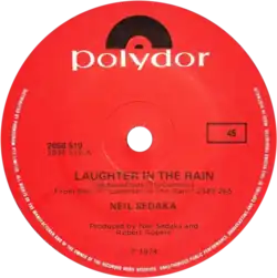 "Laughter in the Rain" is a song composed and recorded by Neil Sedaka, with lyrics by Phil Cody. It includes a 20-second saxophone solo by Jim Horn.[2] The song hit No. 1 on the Billboard Hot 100 in February 1975.
