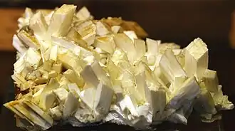 Laumontite is a mineral, one of the zeolite group. Its molecular formula is CaAl2Si4O12·4H2O,[1] a hydrated calcium-aluminium silicate. Potassium or sodium may substitute for the calcium but only in very small amounts.